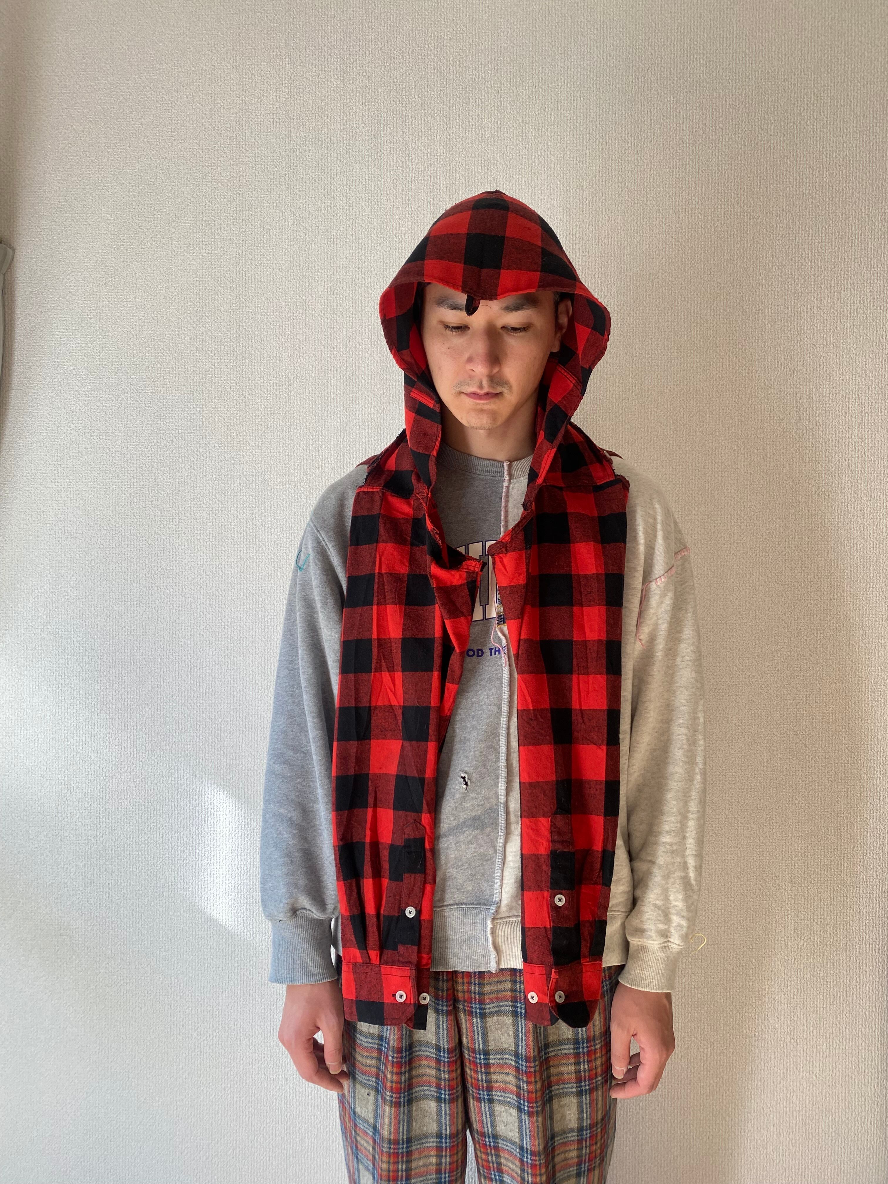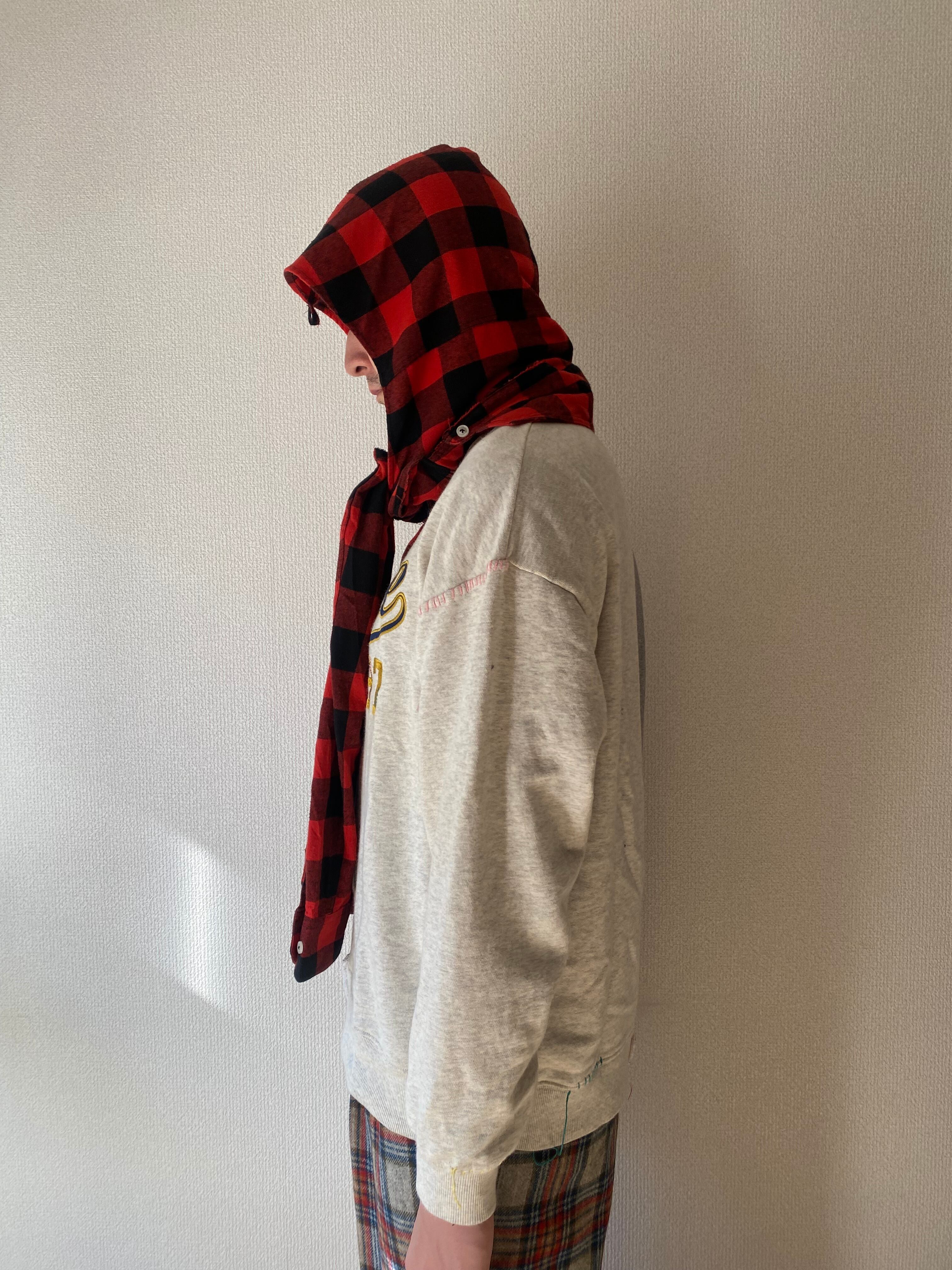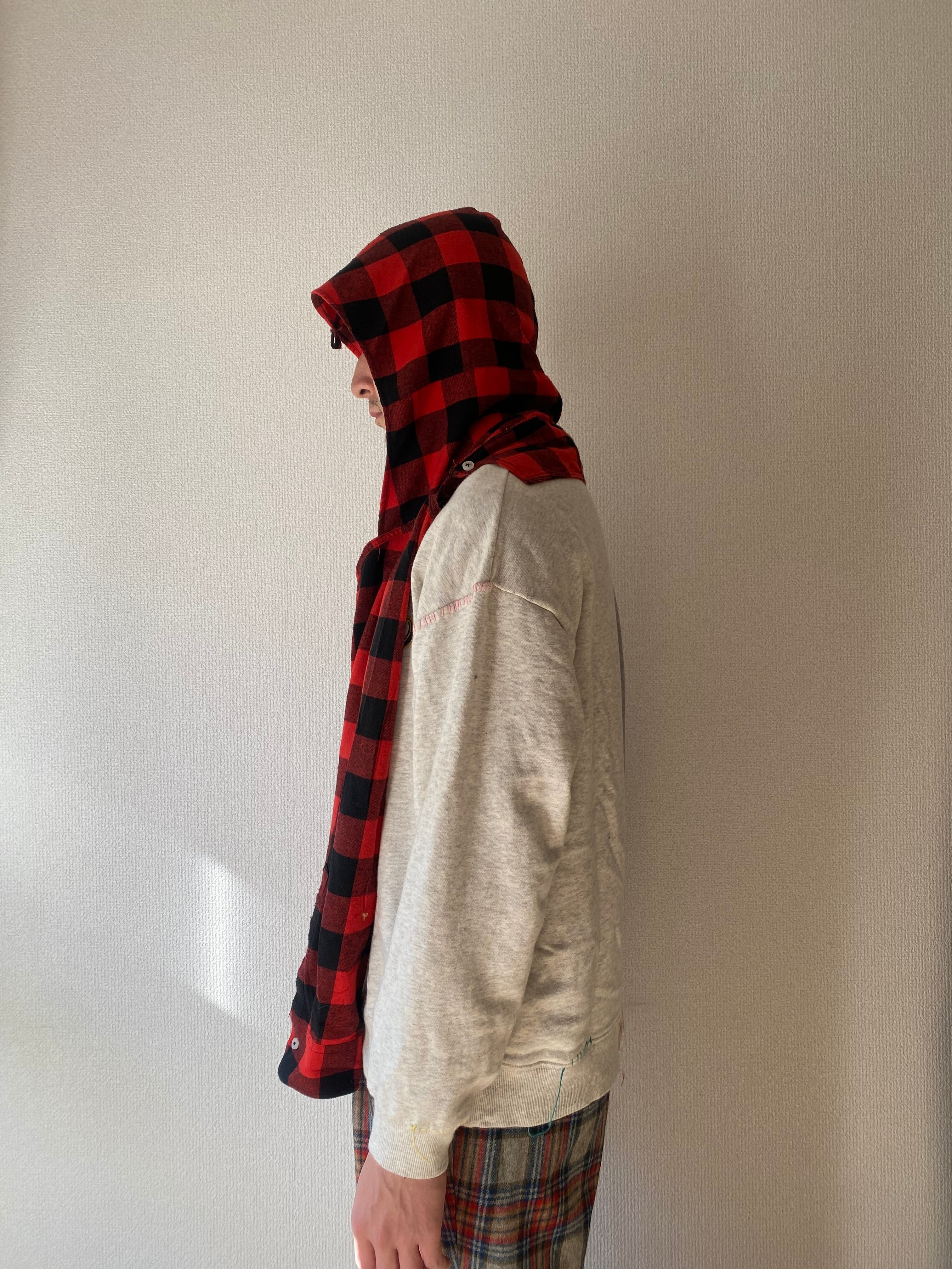 ネルシャツをリメイクして作り上げたフード付ストールが登場です!