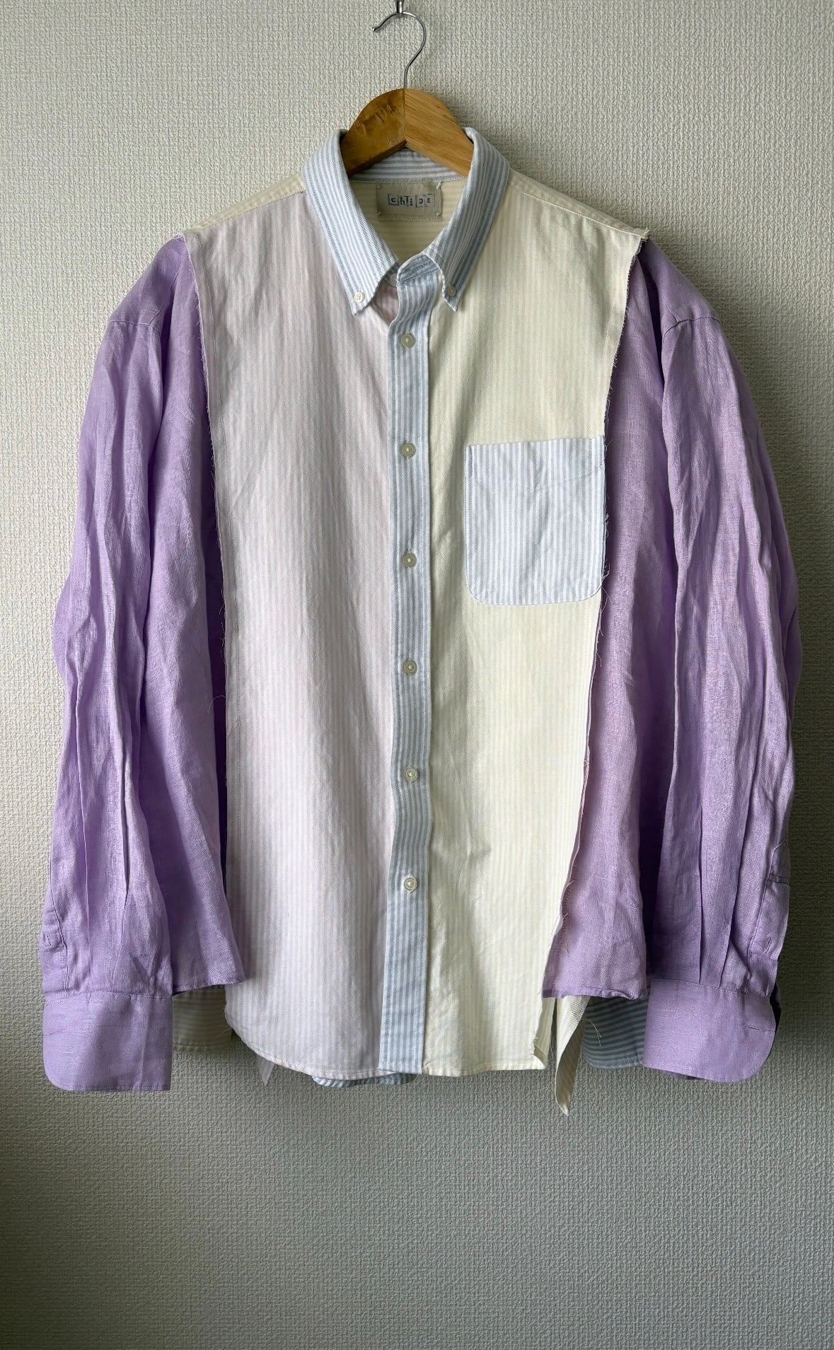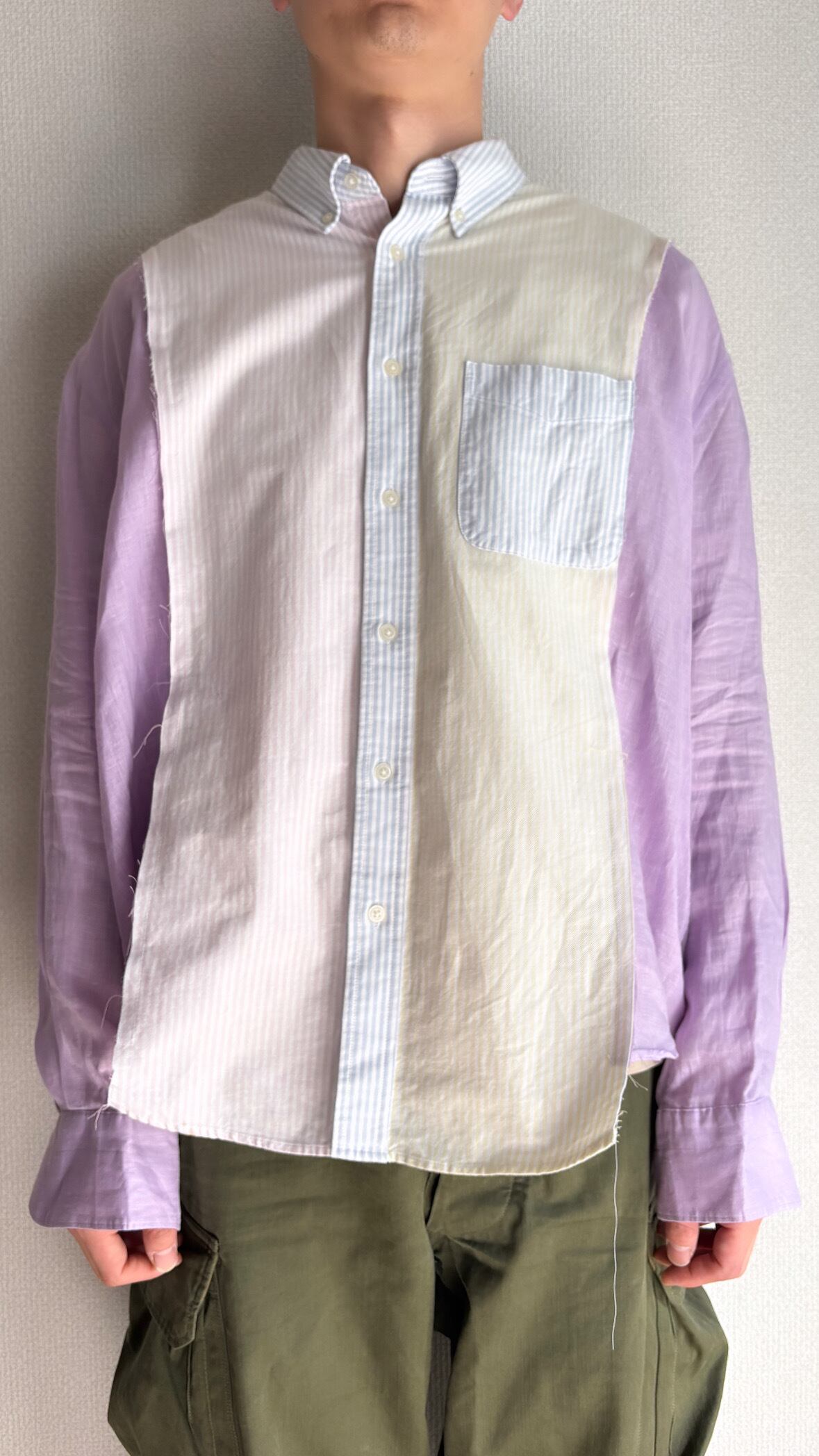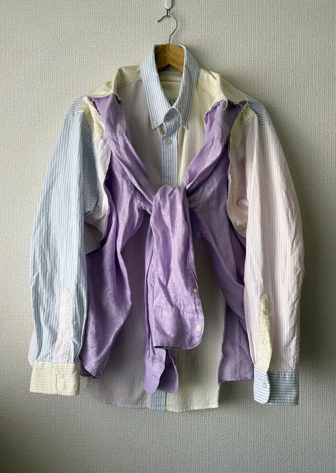 マルチカラーストライプシャツとパープルのネルシャツをドッキングしたデザインですが、