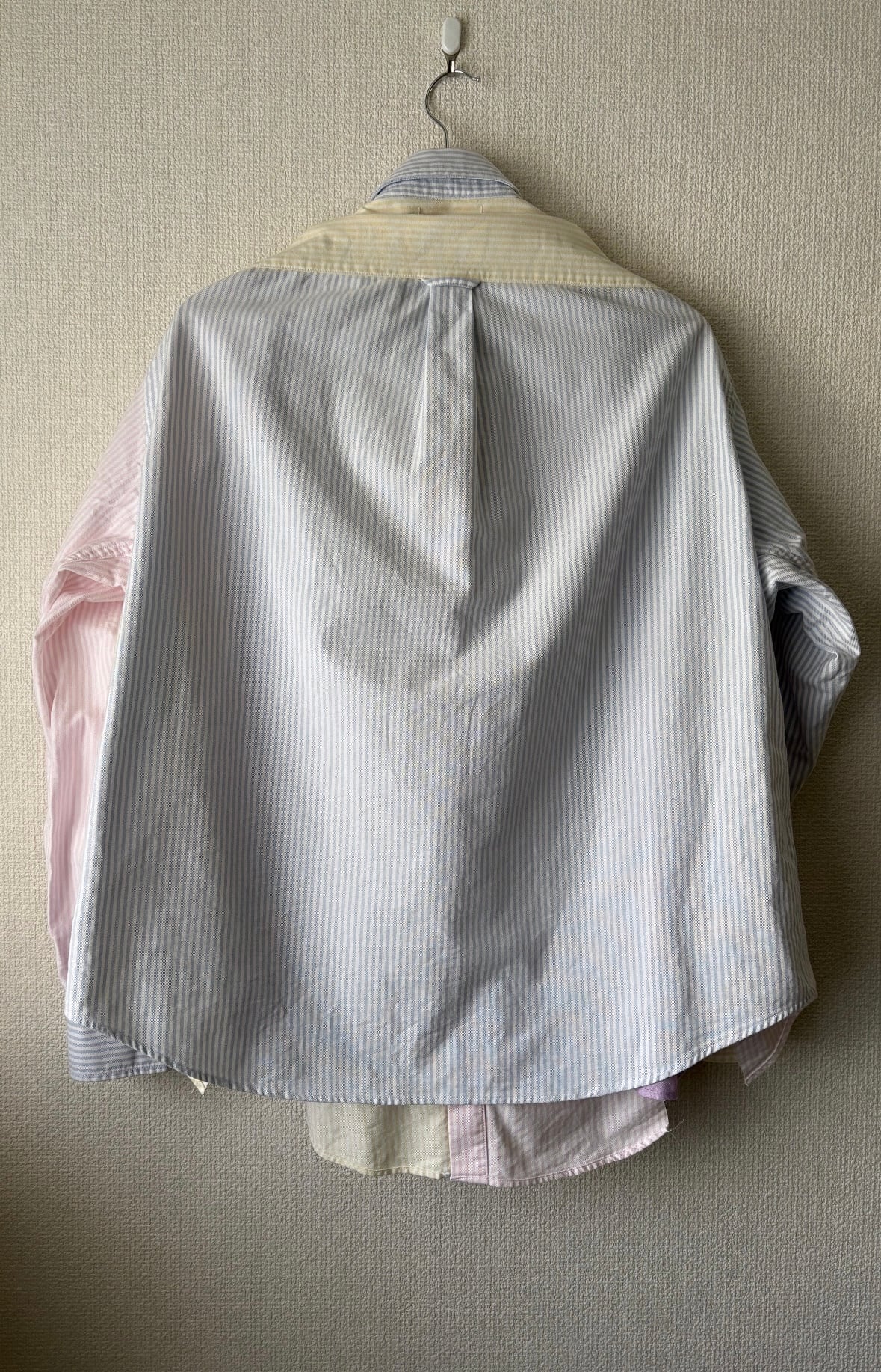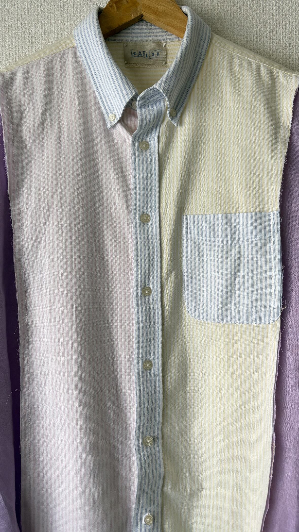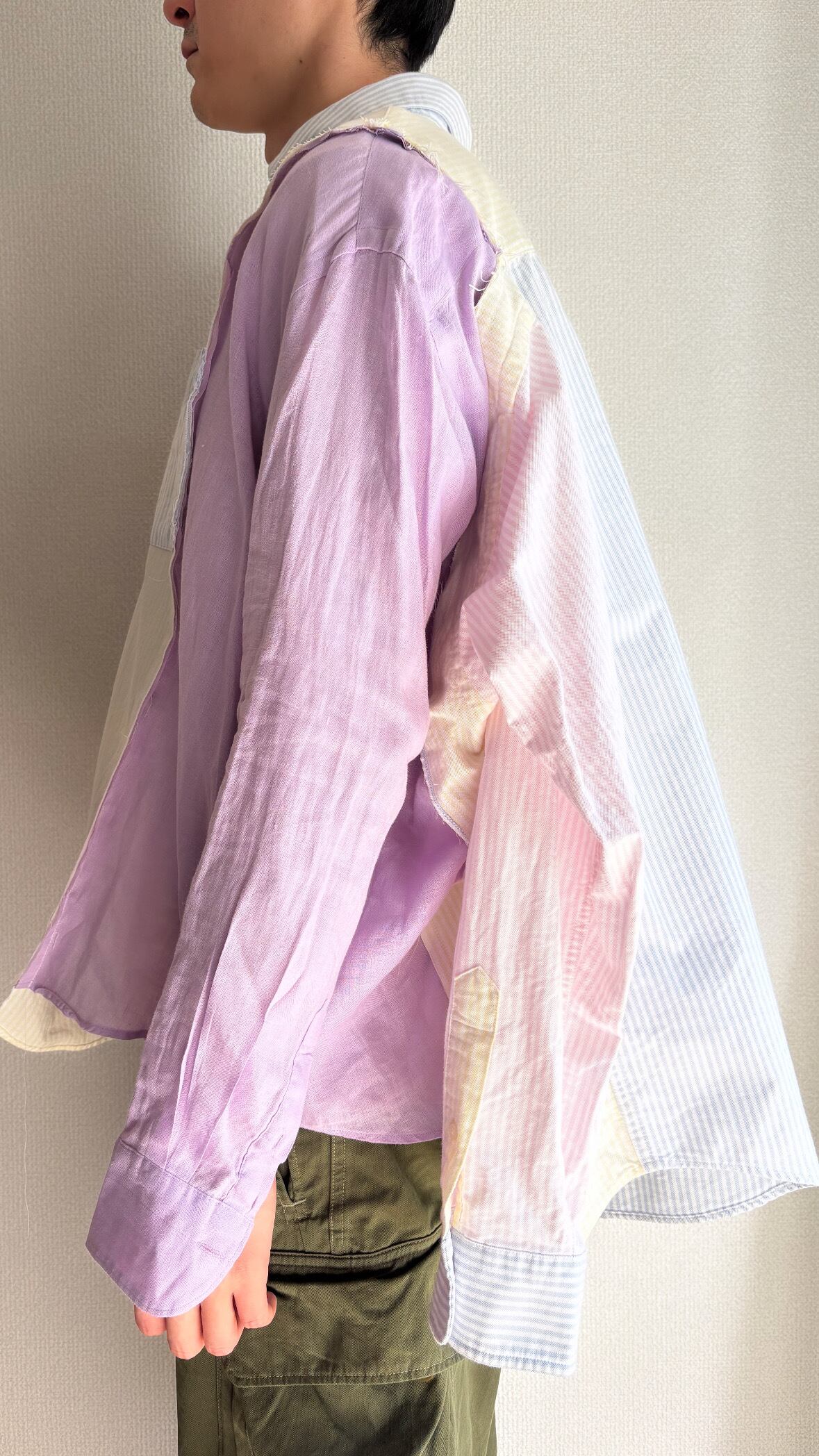 マルチカラーストライプシャツとパープルのネルシャツをドッキングしたデザインですが、