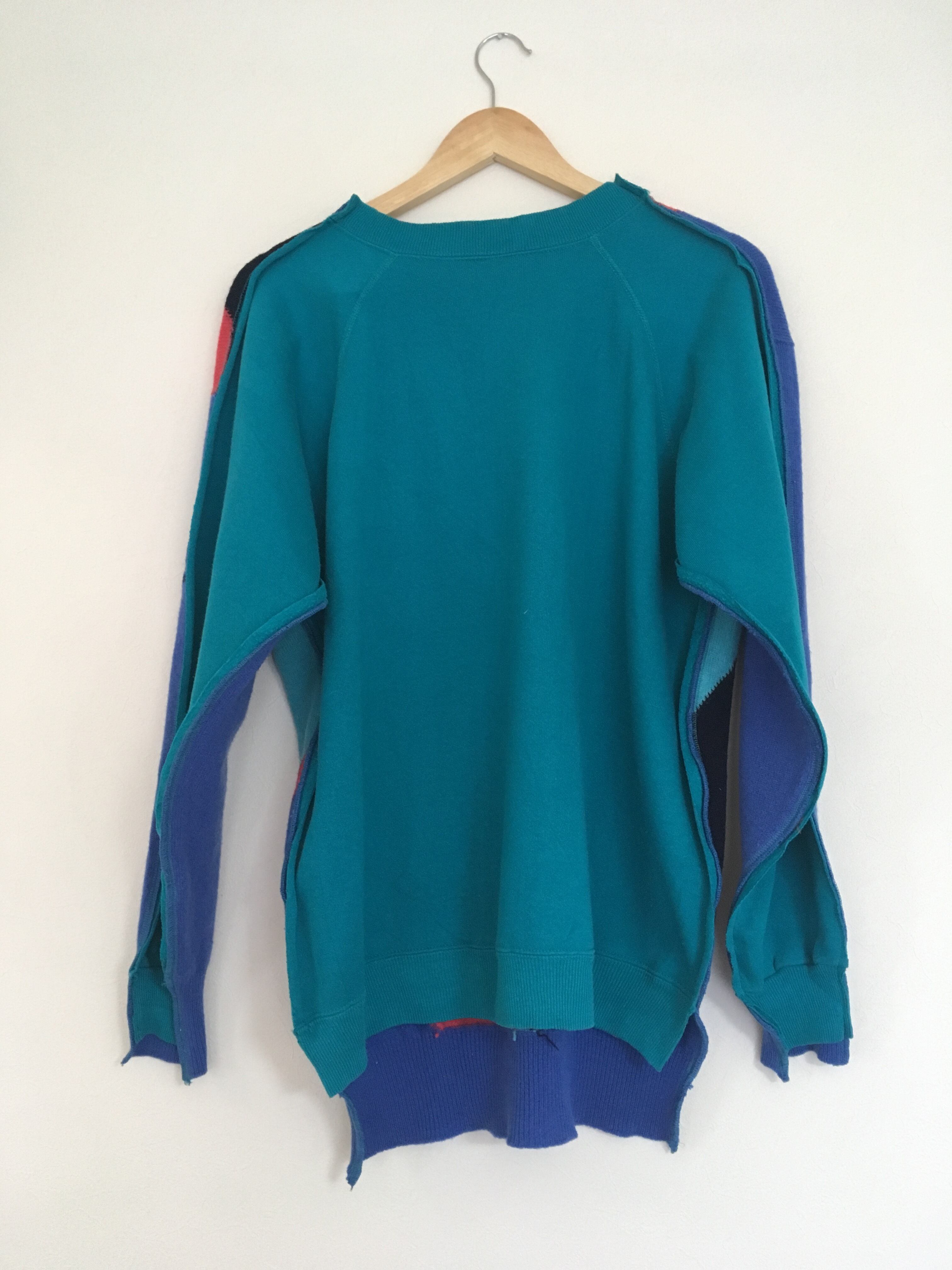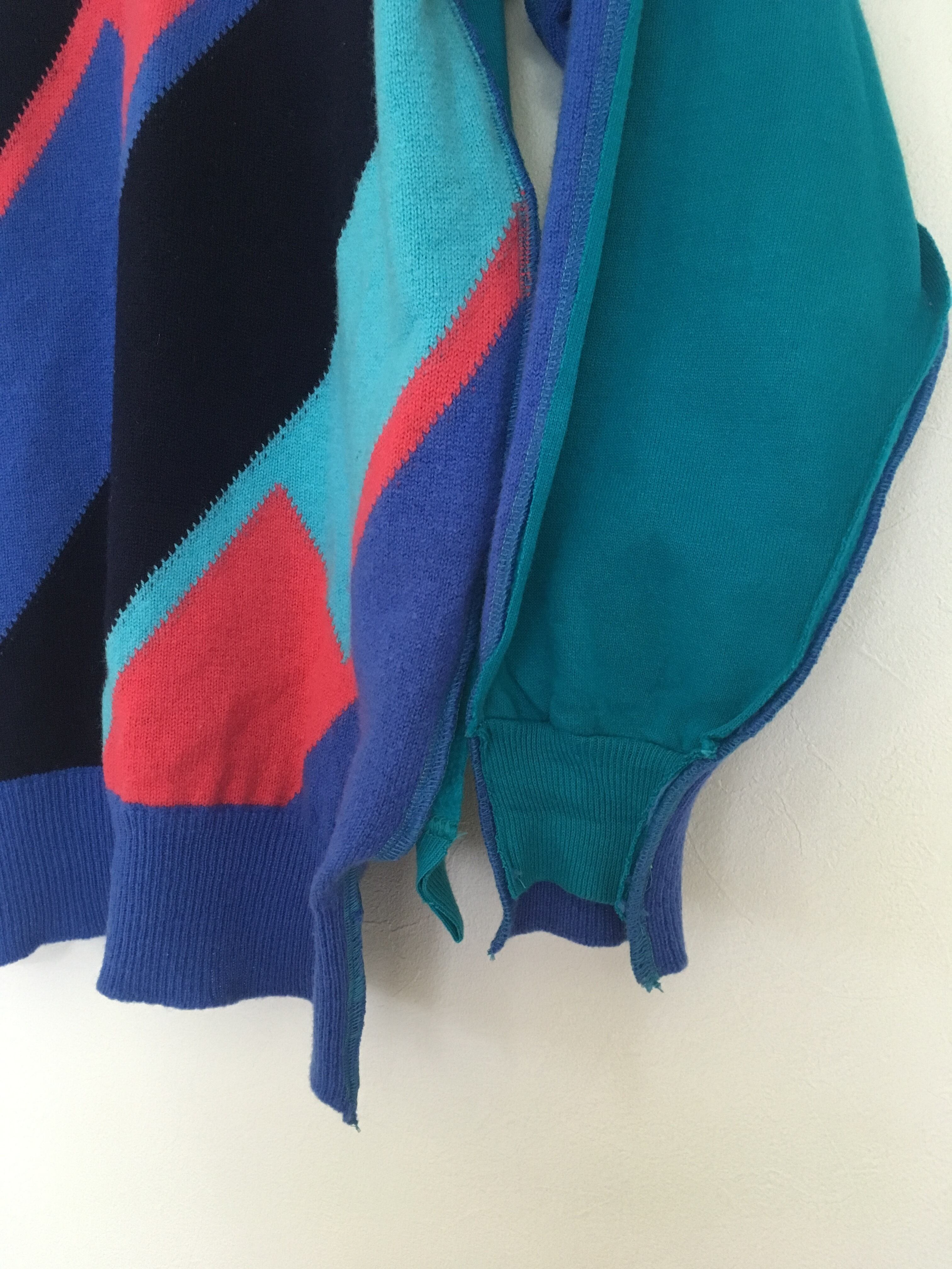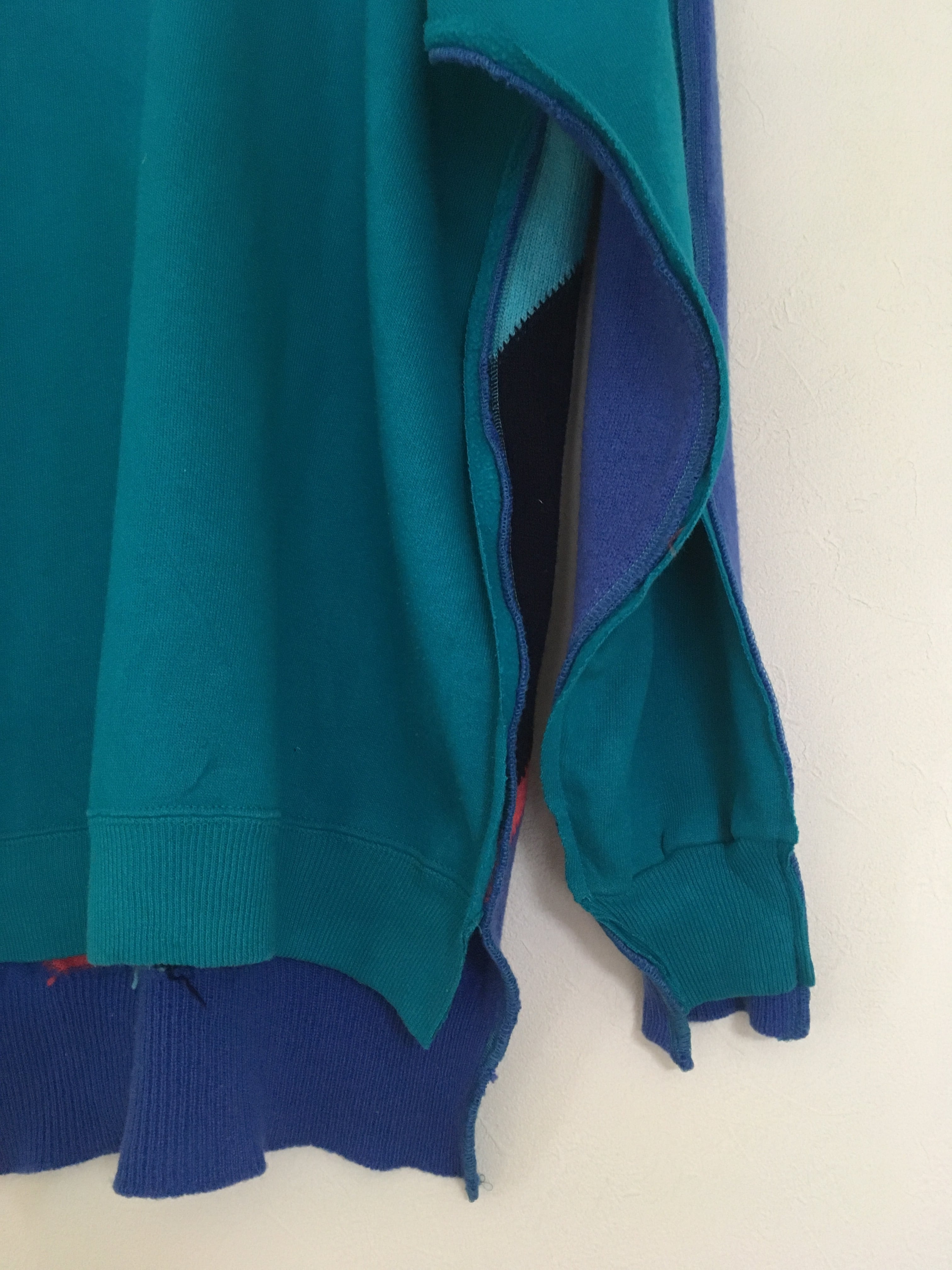 グラフィック柄のウール100%のニットを前面にして、背中側はビリジアンカラーのスウェットを配置しました。