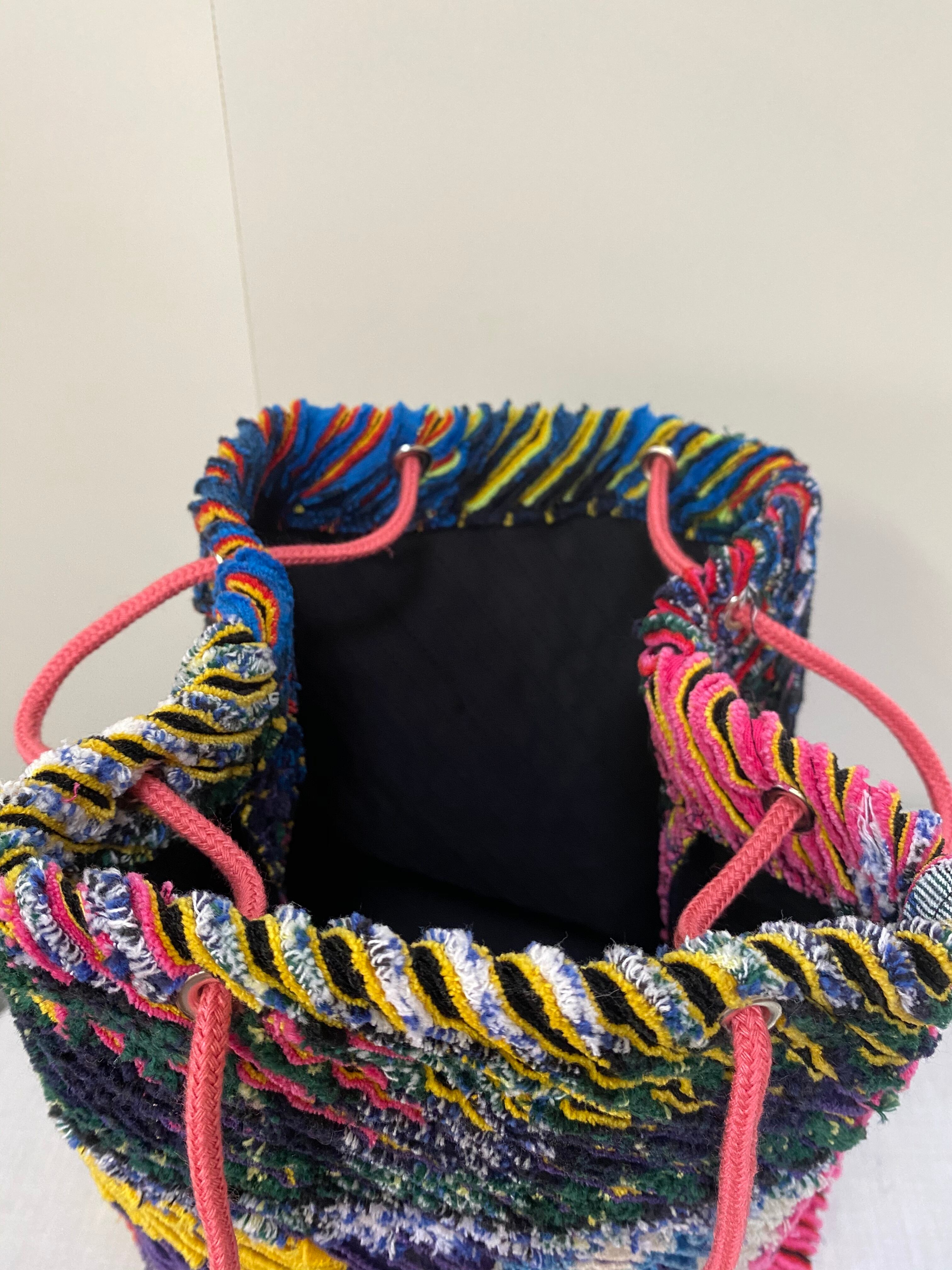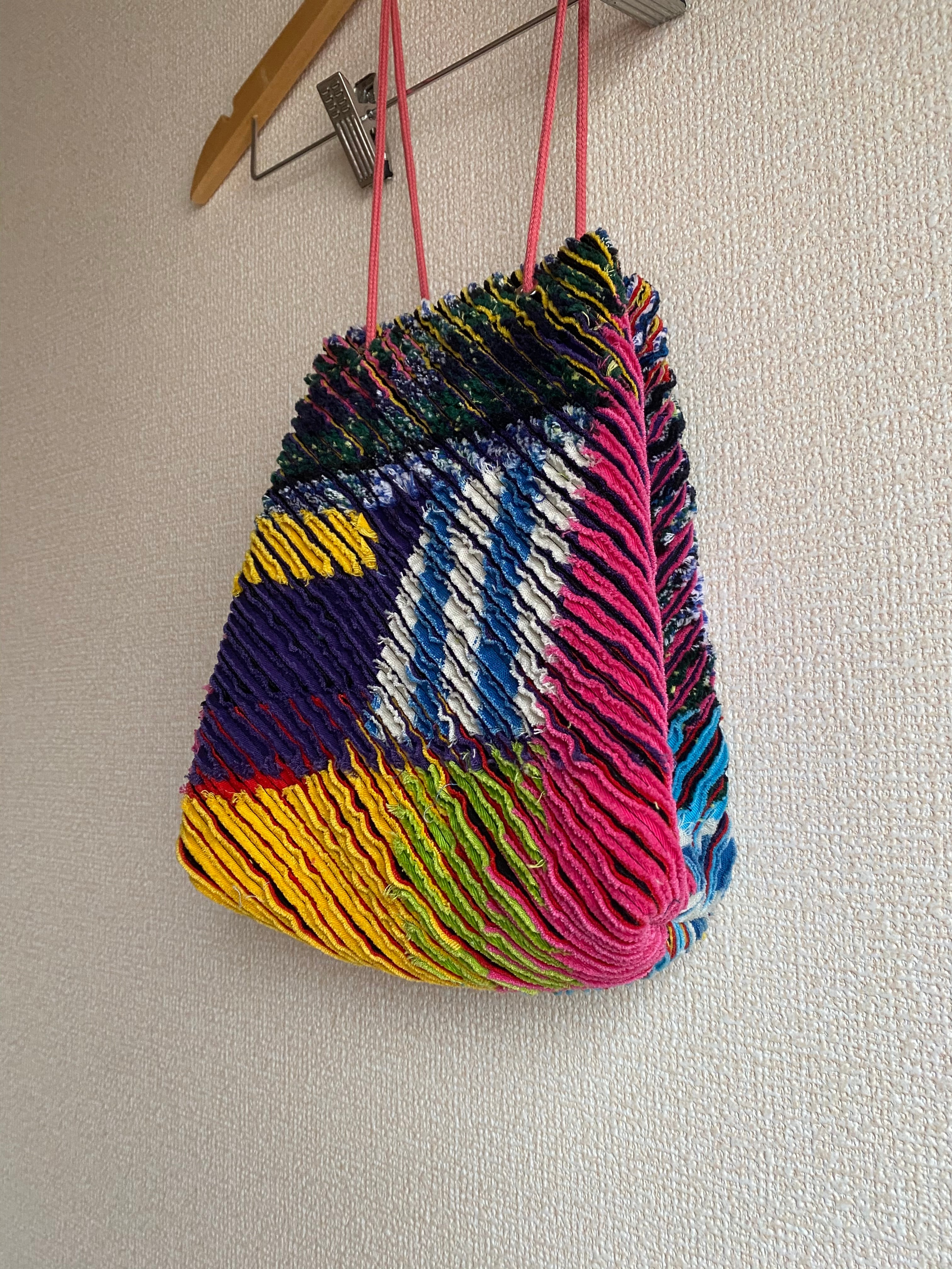スラッシュキルトの手法で作った生地で鳩目開けの巾着バッグを作りました。