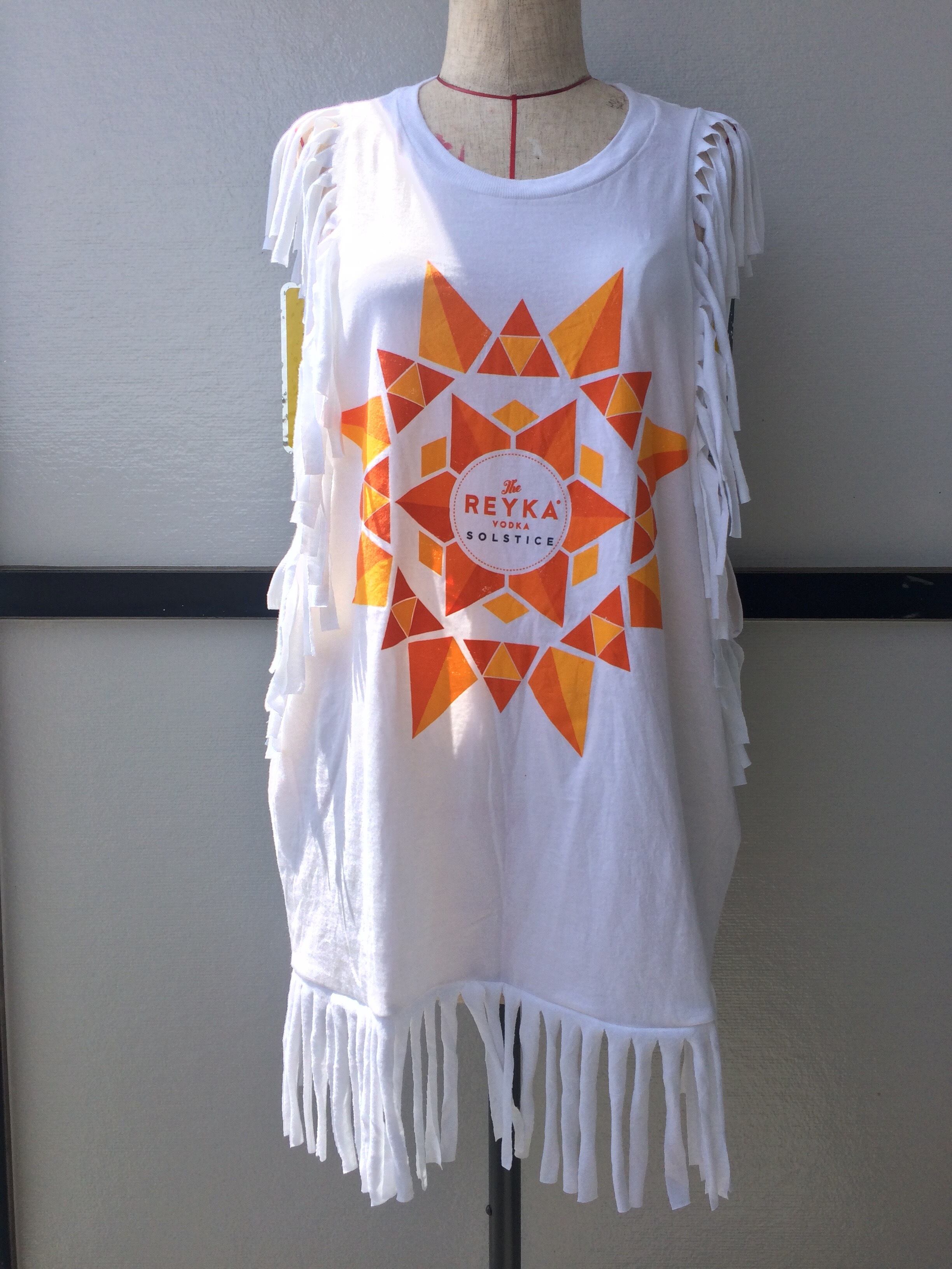 両肩と裾にTシャツの共生地で作ったフリンジを付けました。