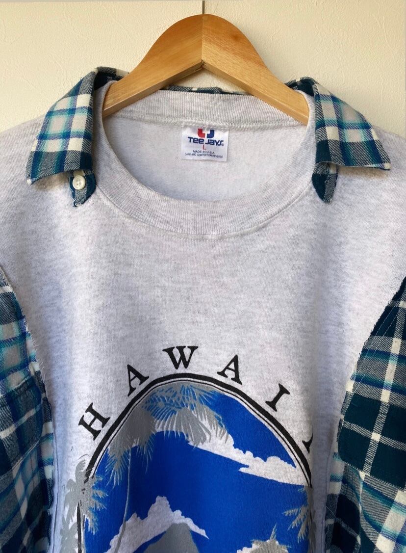 古着スウェットをベースにチェックネルシャツをドッキングして、ビッグシルエットに仕立てました。