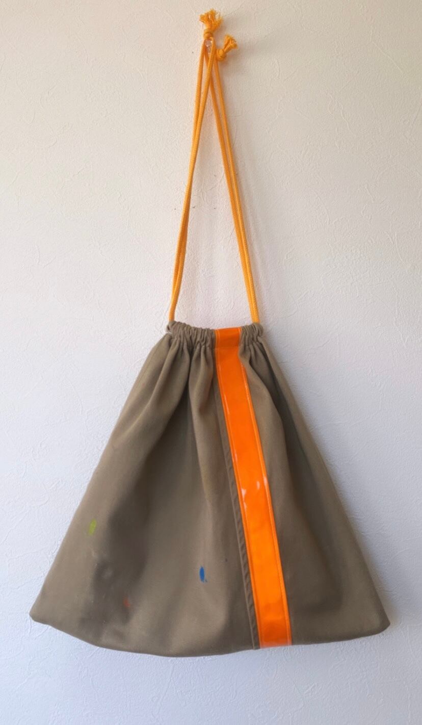 ペンキ汚れの付いたチノパンからリメイクした巾着バッグです。