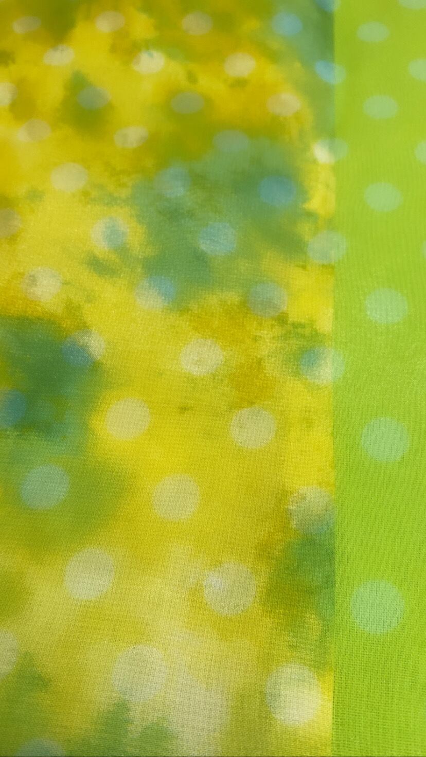 タイダイプリント生地の上にドット柄オーガンジーを重ねました。