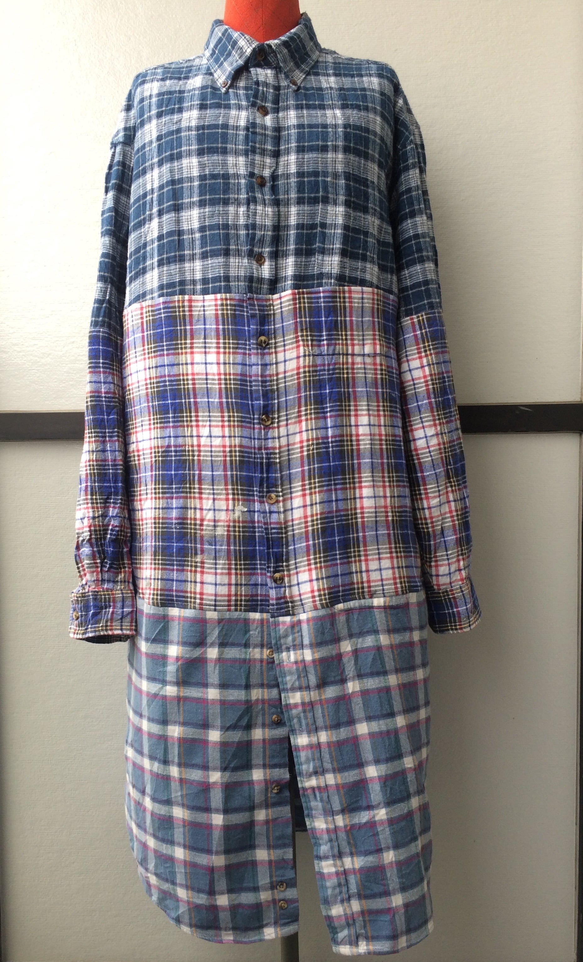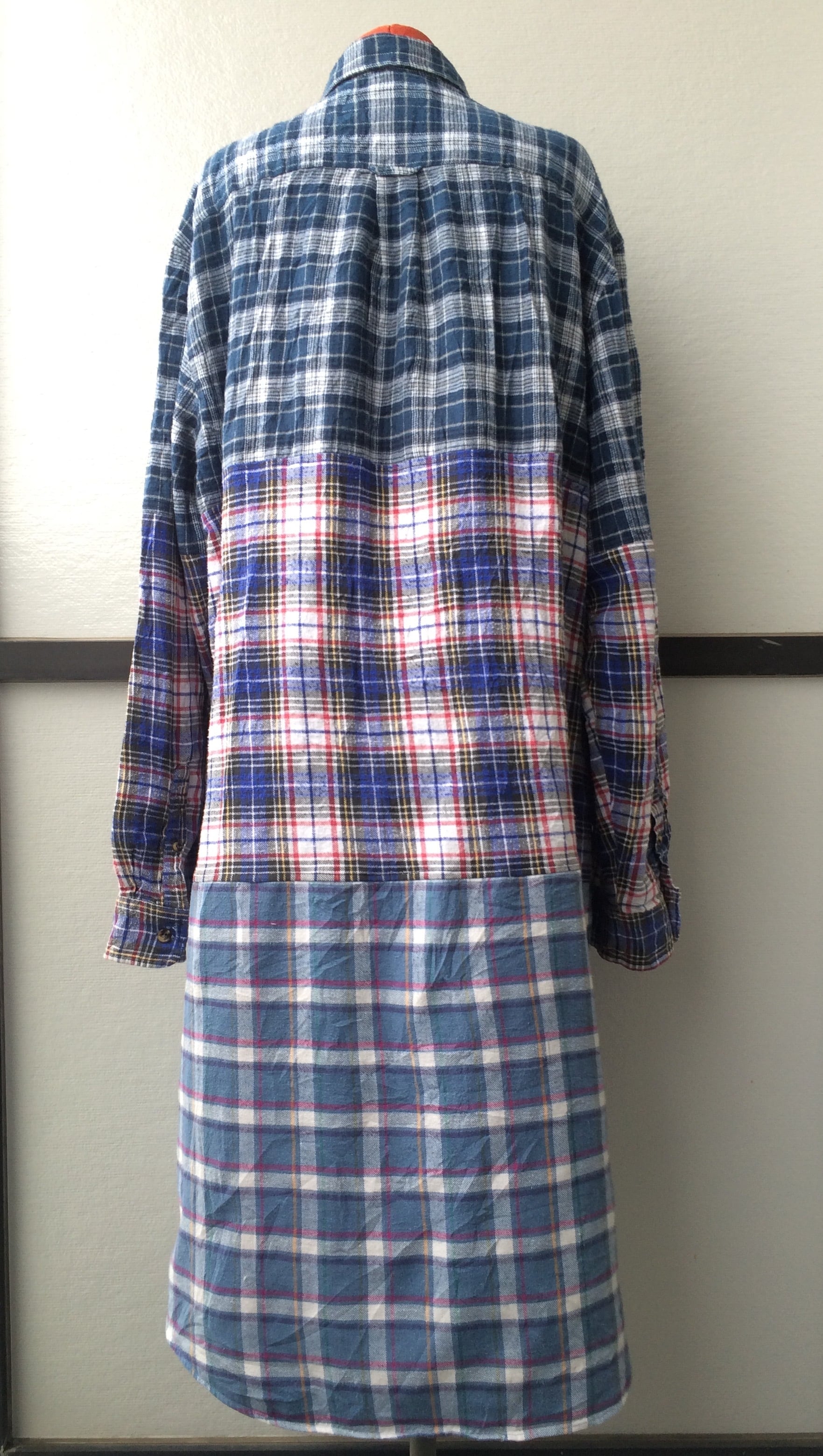 古着のネルシャツを3枚はぎ合わせた膝下丈のロングシャツです。
