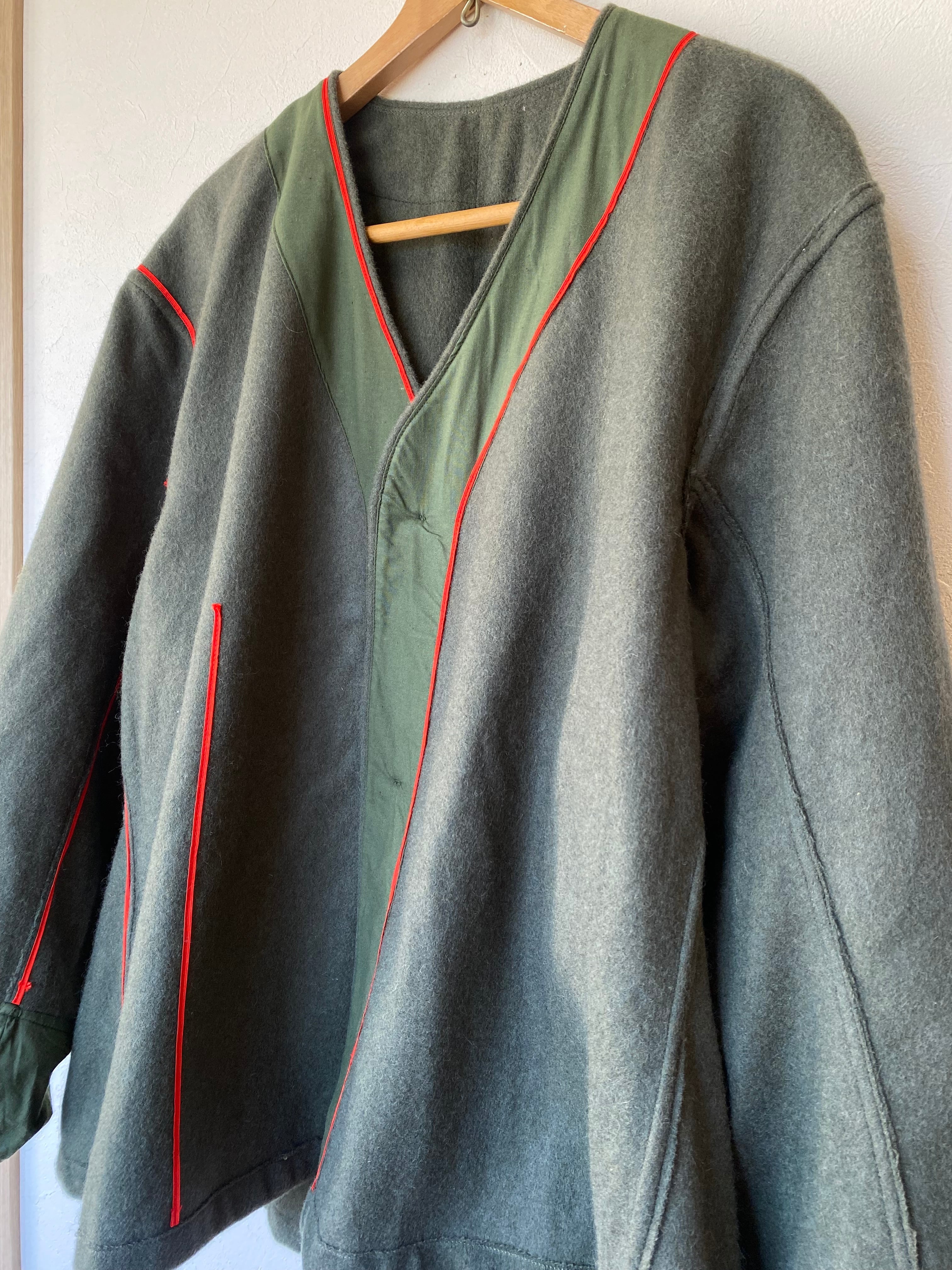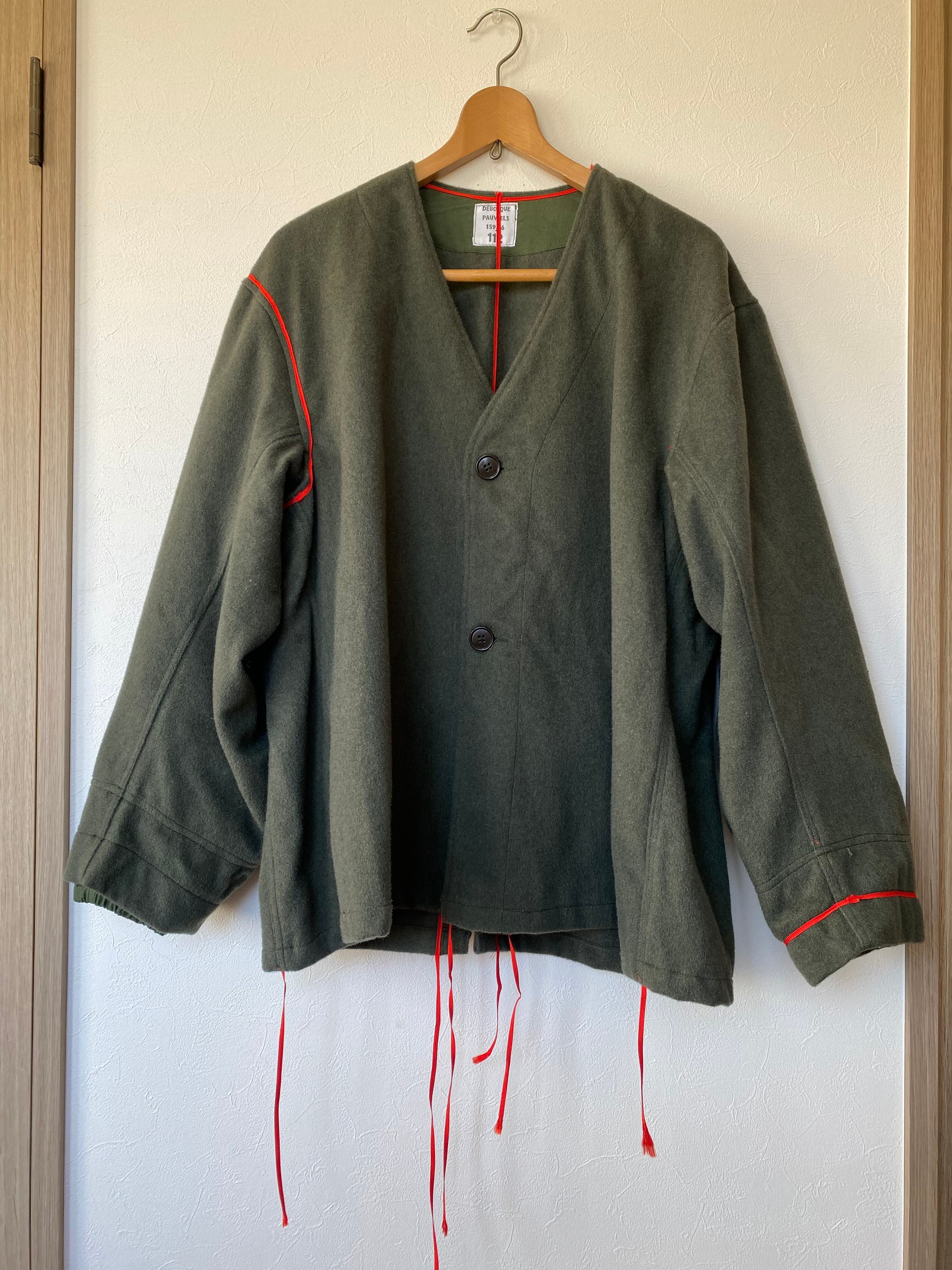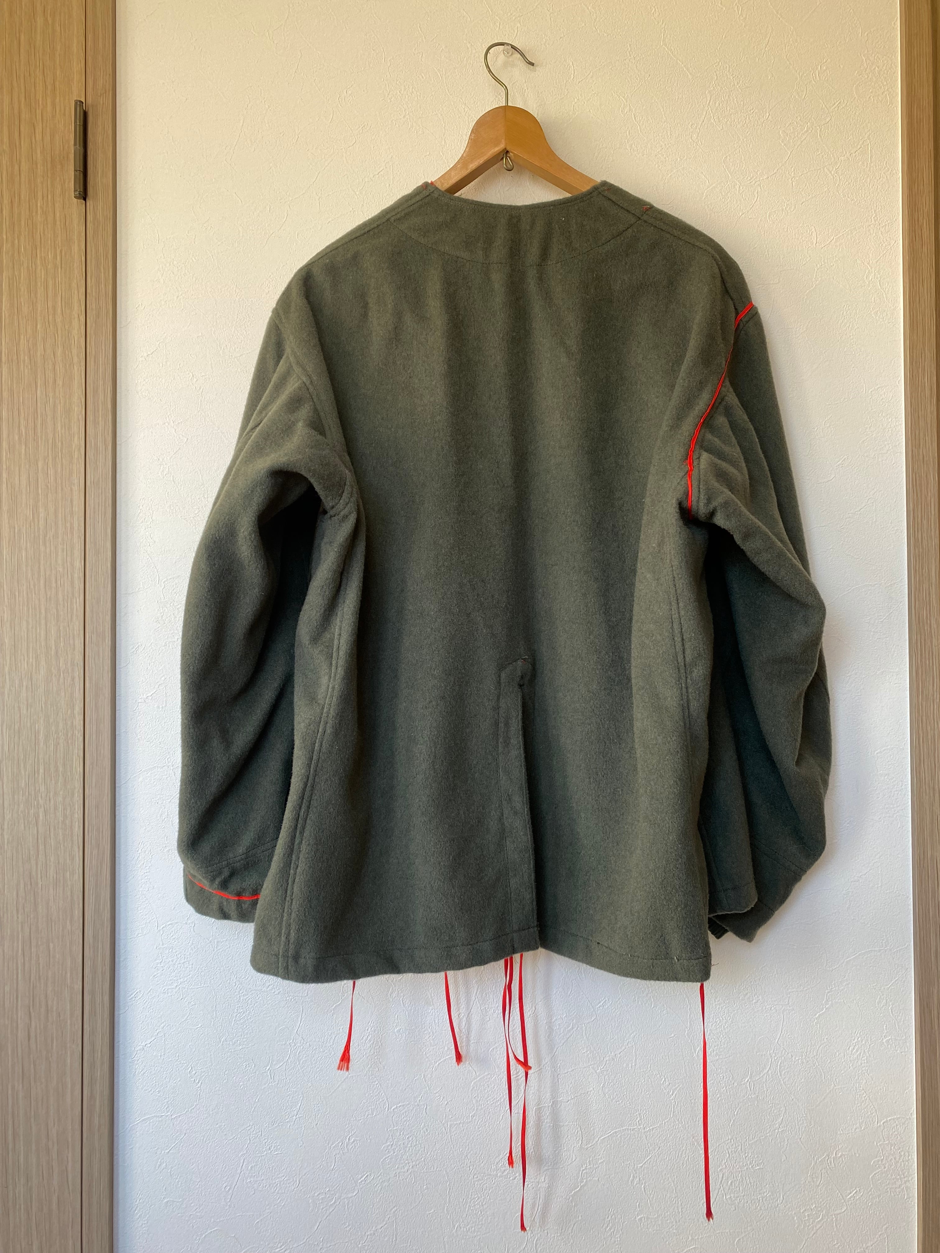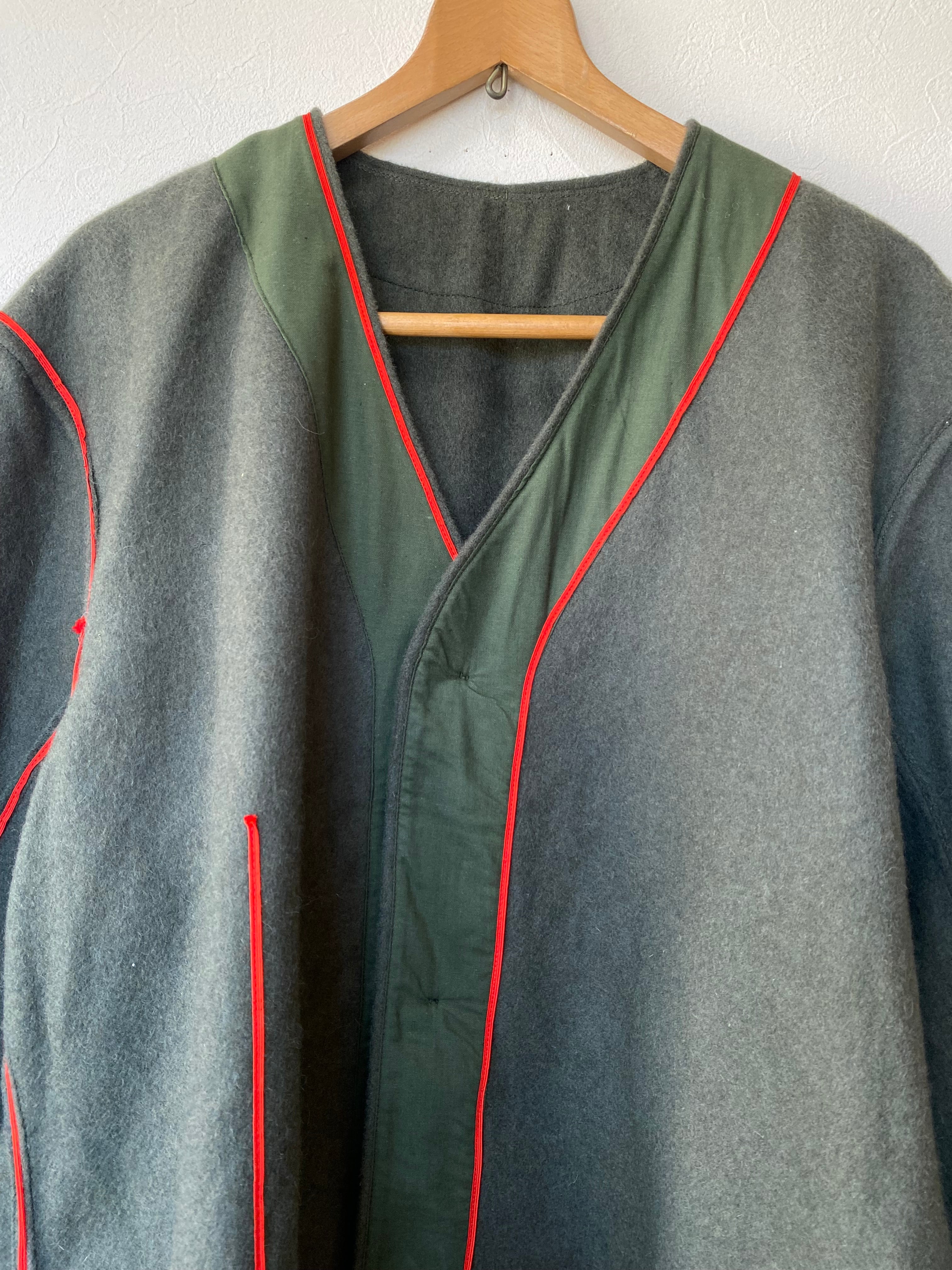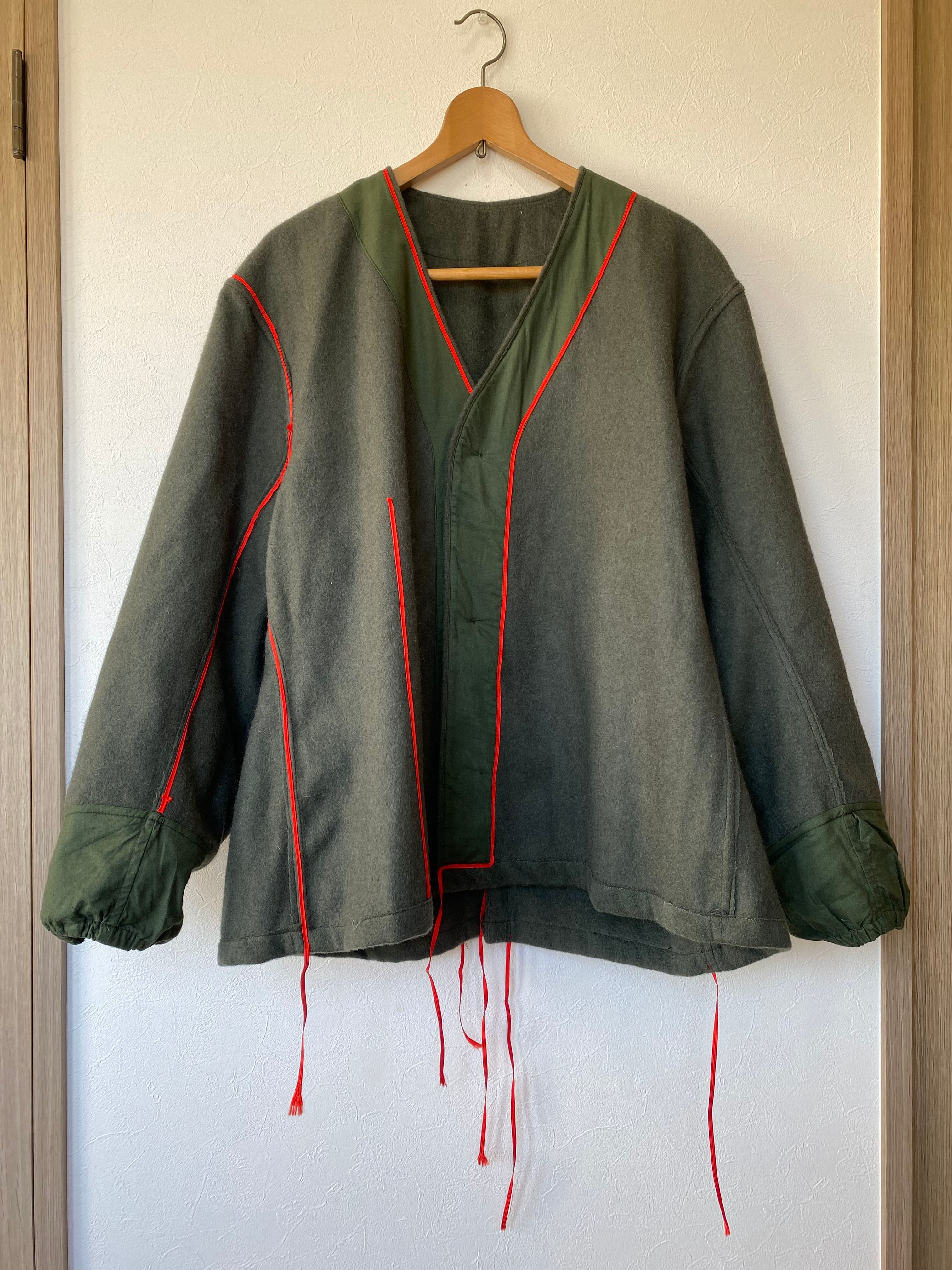 軍物のフェルトコートに鮮やかな赤のテープを縫い付けてリメイクしました。リバーシブルで着用出来ます。表と裏で違う表情を見せる楽しみを味わってください。