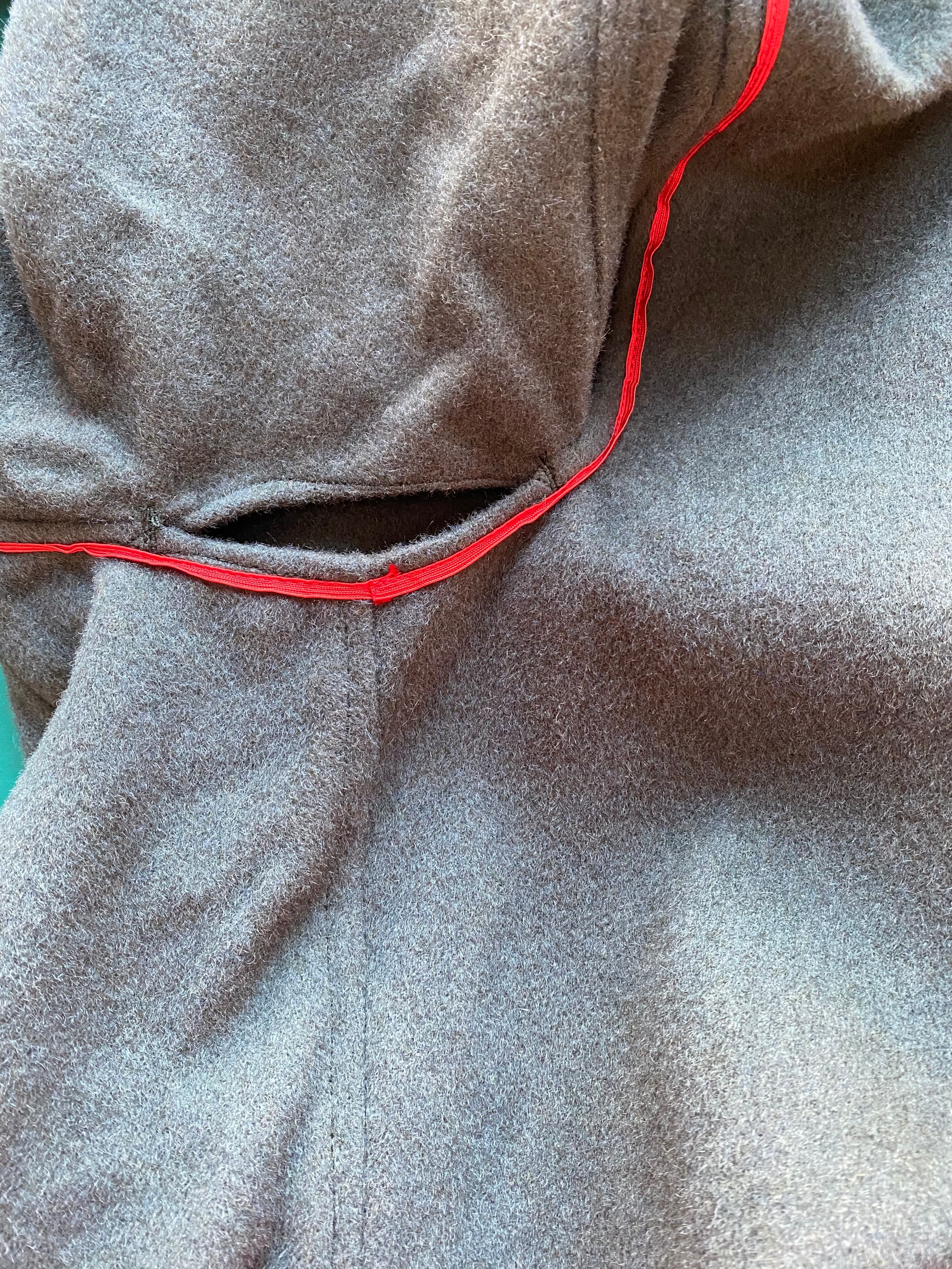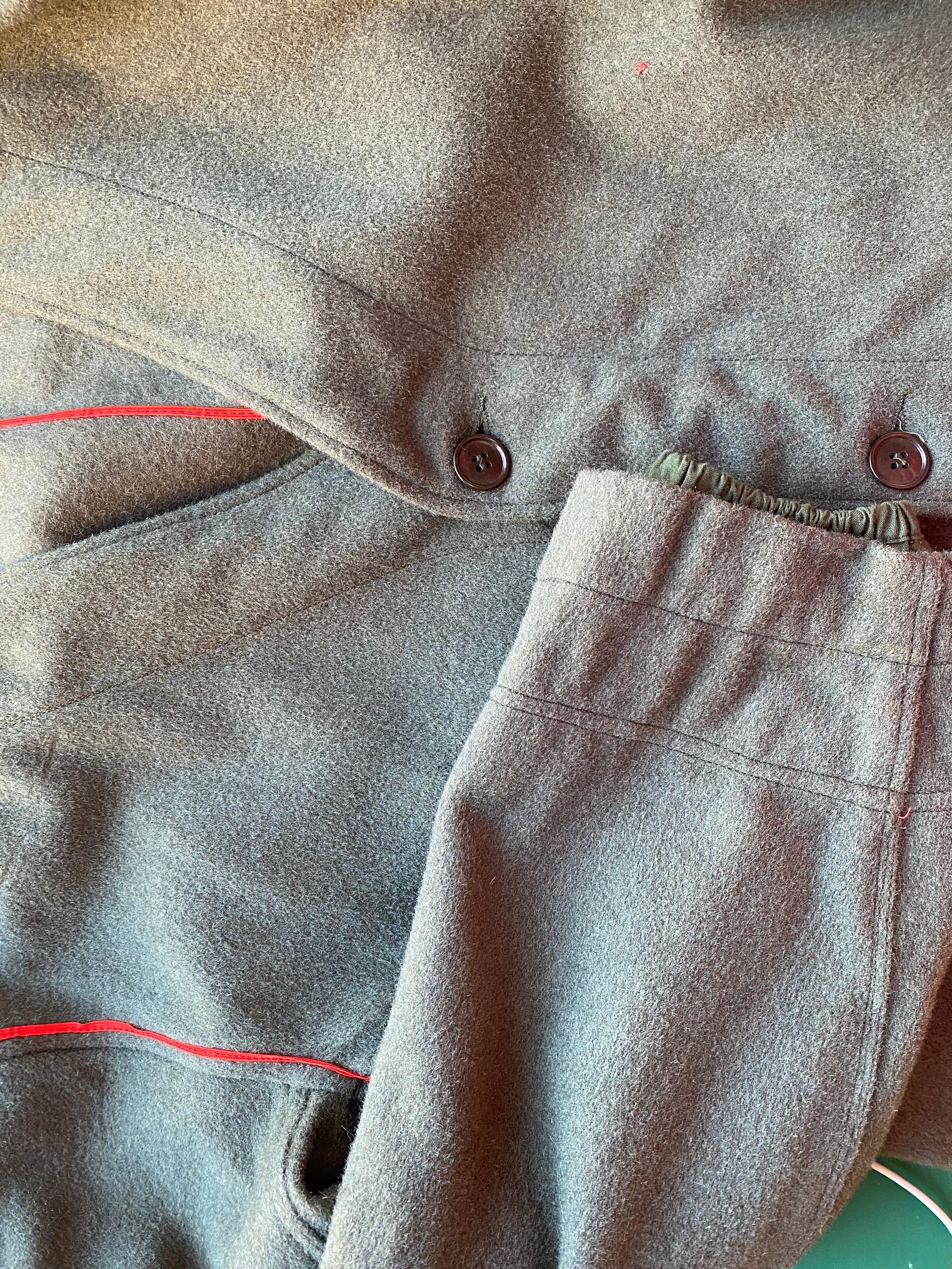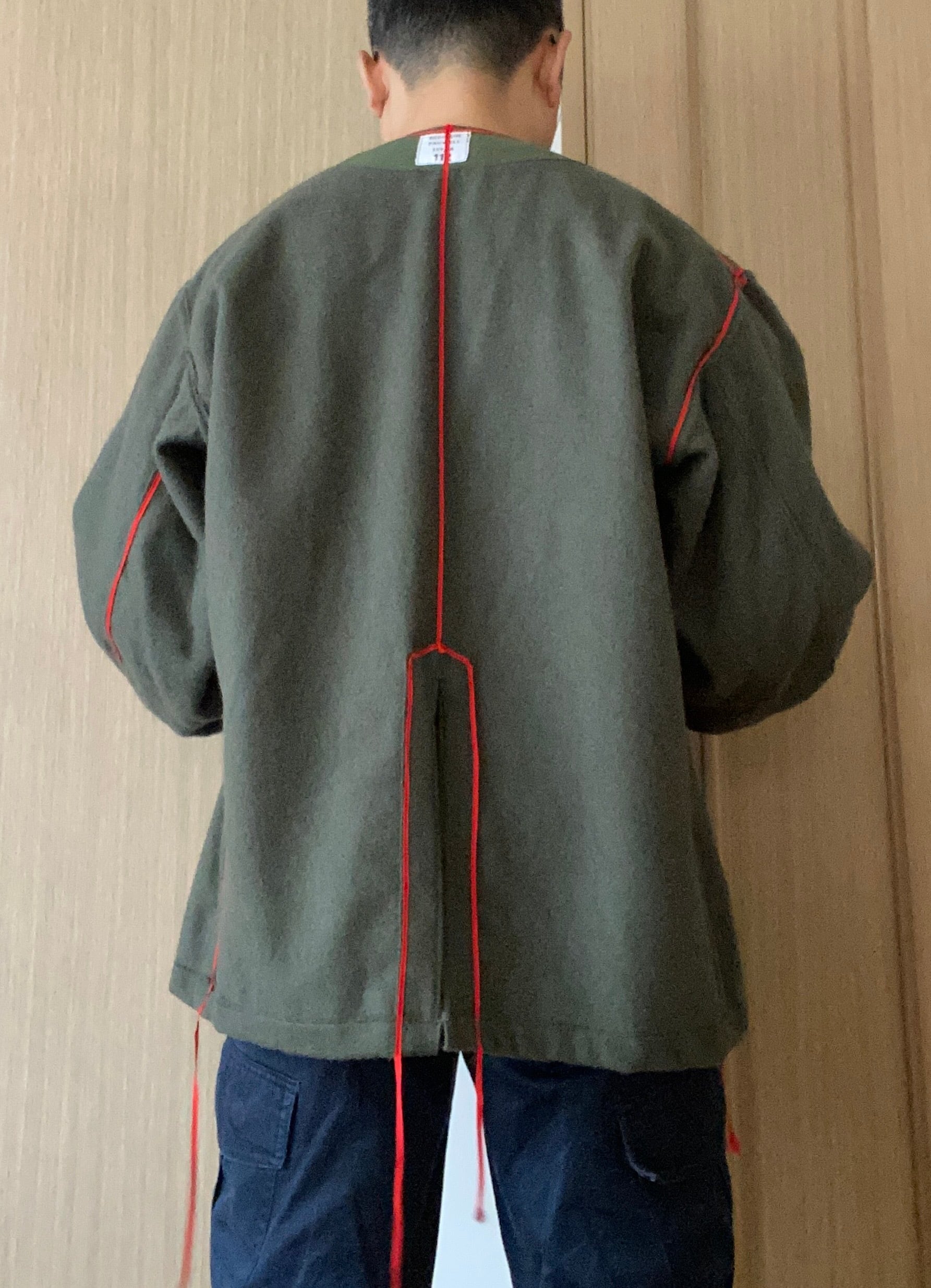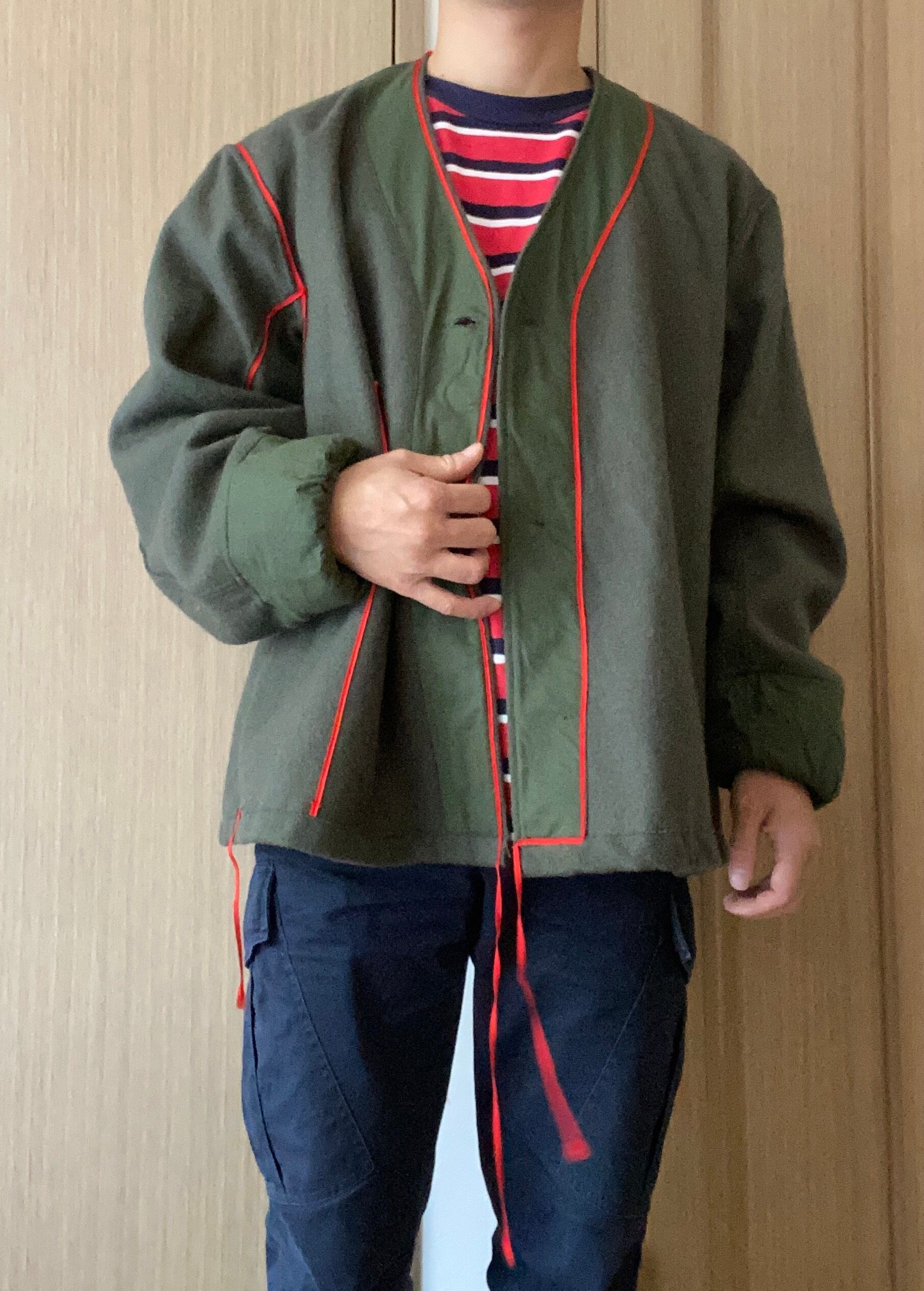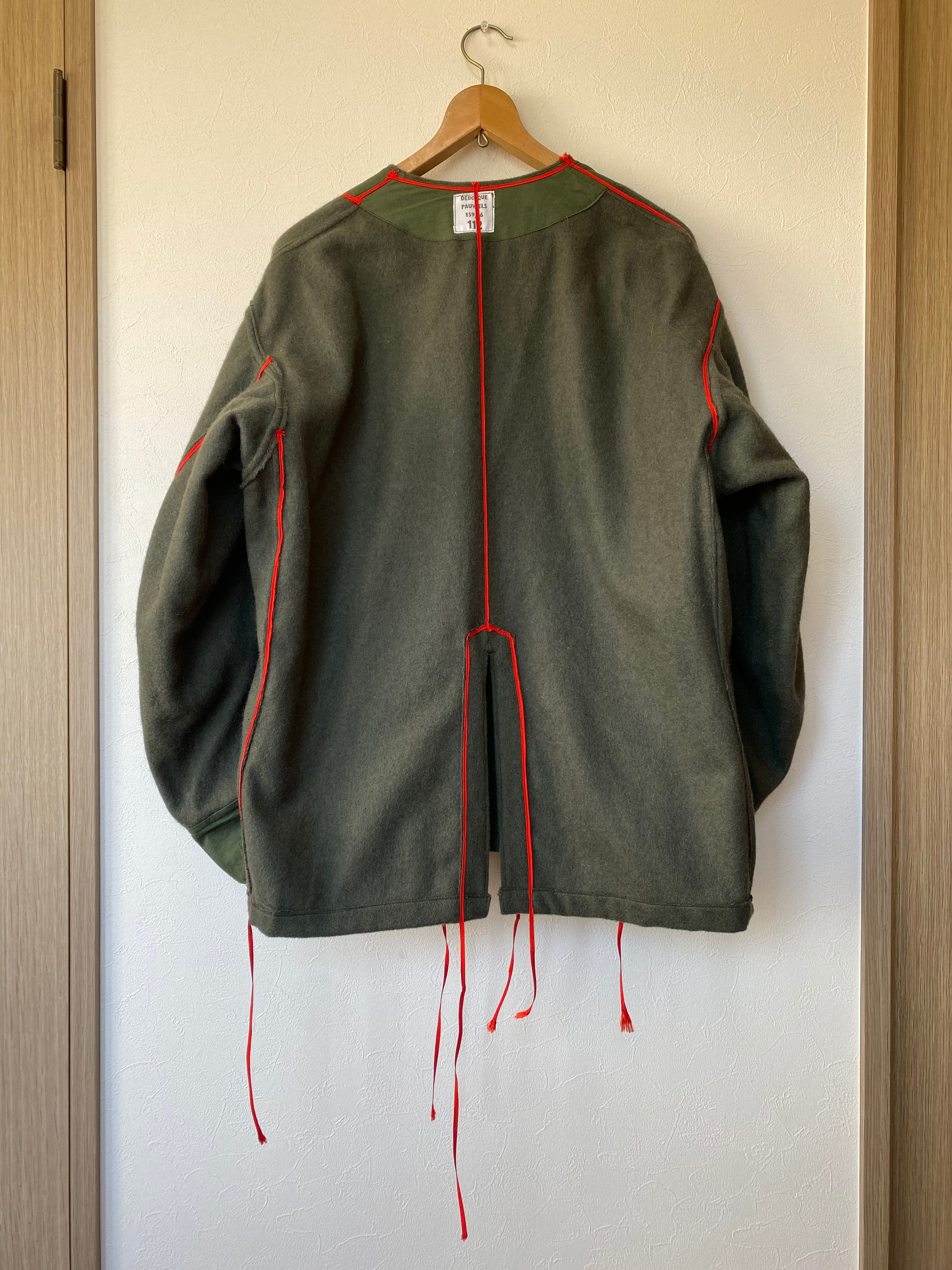 軍物のフェルトコートに鮮やかな赤のテープを縫い付けてリメイクしました。リバーシブルで着用出来ます。表と裏で違う表情を見せる楽しみを味わってください。
