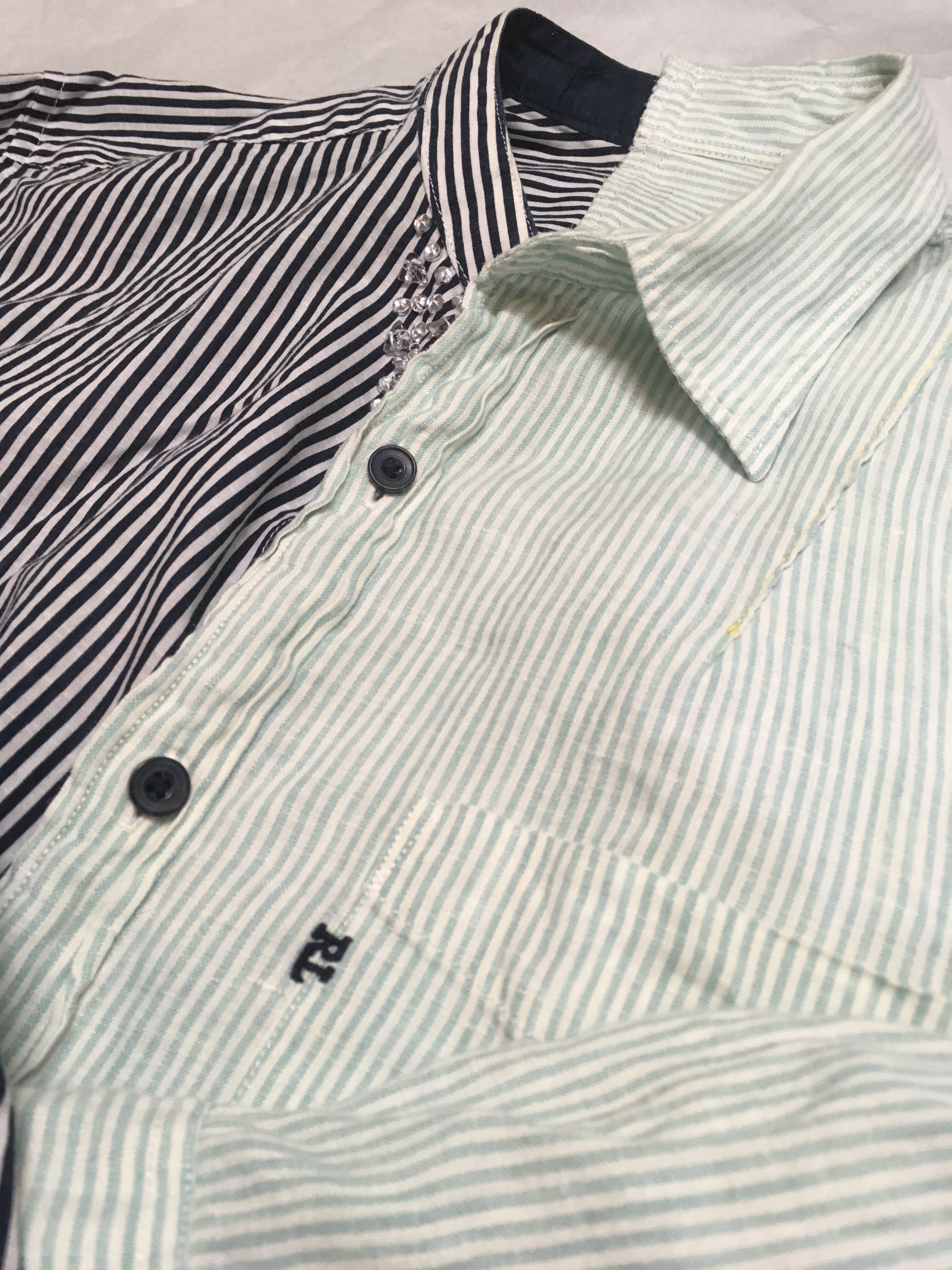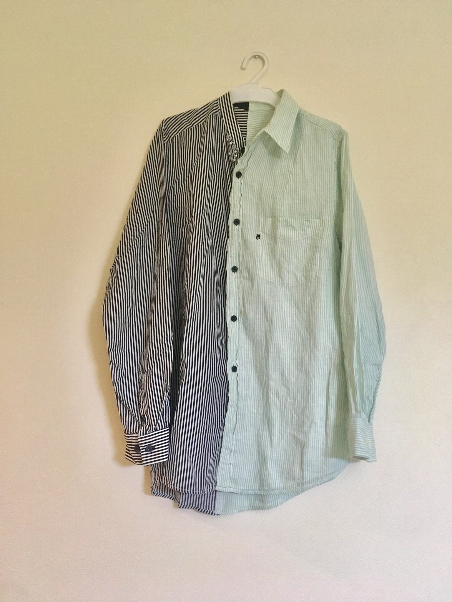 ラルフローレンの淡いグリーンストライプシャツに、同じピッチのストライプシャツをドッキング。
